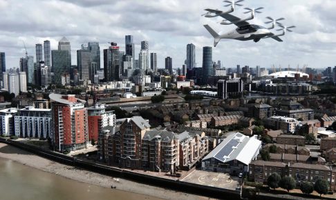 【Flightglobal提供:シンガポール市街地上空を飛ぶエアアジアのVertical Aerospace社のeVTOL機想像図】